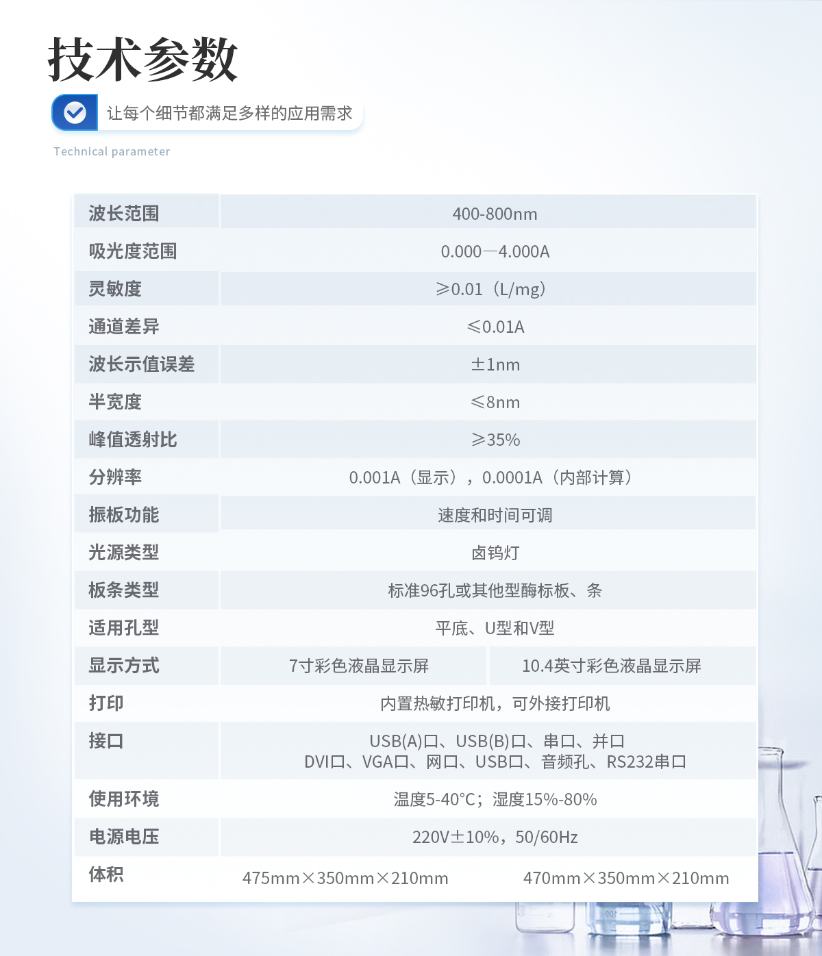 | 系統(tǒng):7英寸彩色觸摸屏,安卓系統(tǒng) | 讀數(shù)范圍 :0-4.000Abs | 濾光片帶寬:8~10nm | 分辨率:0.001Abs | 波長范圍:340-750nm覆蓋整個可見光波長 | 線性范圍:0~3.0Abs,士1%; 3~4.0Abs, 土2% (@405nm) | 準確性:士1% (0-3Abs) 士2% (3- 4Abs) (@405nm) | **性:CV≤0.2%(0-3Abs) CV≤1.0%(3- 4Abs)標準測量模式 (@405nm) | 濾光片:8片濾光片輪,標配4塊濾光片; 405nm,450nm,492nm,630nm,另可選; 配340nm-750nm波長濾光片 | 測量速度: (<6S, 96孔板整板檢測,快速測量模式;單波長<15s/96孔,雙波長<28s/96孔(標準測量模式) | 內存:可存儲200個測量程序和10萬個測結果(96孔板) | 接口:3個USB接口,分別用于連接電腦,打印機和U盤掃碼槍 | 光源:6V10W鹵素燈,壽命可達2000h | 外形尺寸:W440mm×D295mm×H225mm | 電源:AC100-240V, 50-60Hz, 2A | 凈重:10kg |