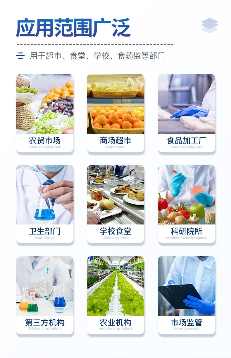 廣泛應(yīng)用于主要用于蔬菜、水果、茶葉、糧食、農(nóng)副產(chǎn)品等食品中有機(jī)磷和氨基甲酸酯類農(nóng)藥殘留的快速檢測;此外還可用于果蔬茶生產(chǎn)基地和農(nóng)貿(mào)批發(fā)銷售市場現(xiàn)場檢測,餐館、學(xué)校、食堂、家庭果蔬加工前的安全速測等。