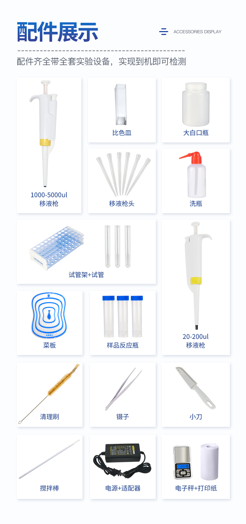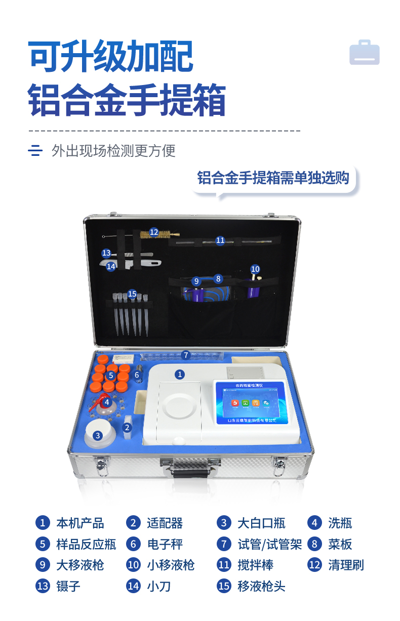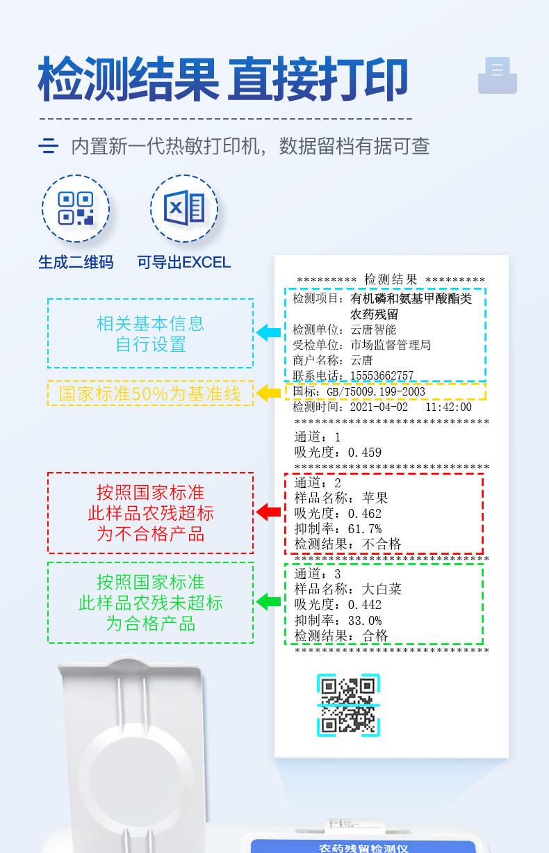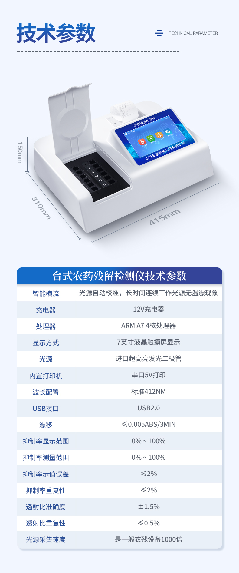 | 乙酰膽堿酯酶和丁酰膽堿酯酶試劑均可以使用,符合國家標(biāo)準(zhǔn)和農(nóng)業(yè)部標(biāo)準(zhǔn)的要求。 | 自動(dòng)判斷樣品是否合格,檢測結(jié)果更加直觀。 | 儀器具有100多種蔬菜名稱菜單庫,分類管理,并可按需添加或刪除蔬菜名,編輯蔬菜名稱,可直接打印出蔬菜名稱。 | 檢測通道:12個(gè)檢測通道,可以同時(shí)測試多個(gè)樣品,循環(huán)檢測,即放即檢,每個(gè)樣品由程序控制分別獨(dú)立工作,不會(huì)互相干擾。 | 智能操作系統(tǒng),采用更加人性化操作,主控采用多核處理器,主頻1.88Ghz,運(yùn)轉(zhuǎn)速度更快速,穩(wěn)定性更強(qiáng)。 | 顯示方式:7英寸高靈敏真彩觸摸屏顯示,人性化中文操作界面,讀數(shù)直觀、簡單。 | 打印機(jī)采用串口5v打印,可選擇手動(dòng)打印或者自動(dòng)打印,三分鐘出打印結(jié)果,打印格式為檢測人姓名、吸光度差值、檢測時(shí)間、檢測機(jī)構(gòu)、樣品名稱及結(jié)果判定。 | 光源采用進(jìn)口超高亮發(fā)光二極管,具有低功耗、高精度、穩(wěn)定性強(qiáng)、光源可控可以關(guān)掉不使用的光源,響應(yīng)速度快等優(yōu)點(diǎn)。 | 智能恒流穩(wěn)壓,光強(qiáng)自動(dòng)校準(zhǔn),長時(shí)間連續(xù)工作光源無溫漂現(xiàn)象。 | 儀器具有GPRS遠(yuǎn)傳功能,可插手機(jī)卡實(shí)現(xiàn)數(shù)據(jù)遠(yuǎn)傳平臺(tái),wifi聯(lián)網(wǎng)功能,可將數(shù)據(jù)快速上傳電腦,進(jìn)行數(shù)據(jù)管理與統(tǒng)計(jì)。 | 采用USB2.0接口設(shè)計(jì),方便數(shù)據(jù)的存貯和移動(dòng),并可隨時(shí)與計(jì)算機(jī)直接相連,并且可用計(jì)算機(jī)控制儀器。實(shí)現(xiàn)數(shù)據(jù)查詢、瀏覽、分析、統(tǒng)計(jì)、打印等。 | 智能化程度高,儀器具有自檢功能:具有開機(jī)自檢和調(diào)零功能,具有自動(dòng)檢測重復(fù)性功能 | 儀器具有自身保護(hù)功能,可設(shè)置用戶名及密碼,防止非工作人員操作等。 | 采用DC12v直流供電,安全系統(tǒng)更高,并且配備6A鋰電池充電器。 | 儀器具有重新校準(zhǔn)、鎖定、恢復(fù)出廠設(shè)置功能。 |